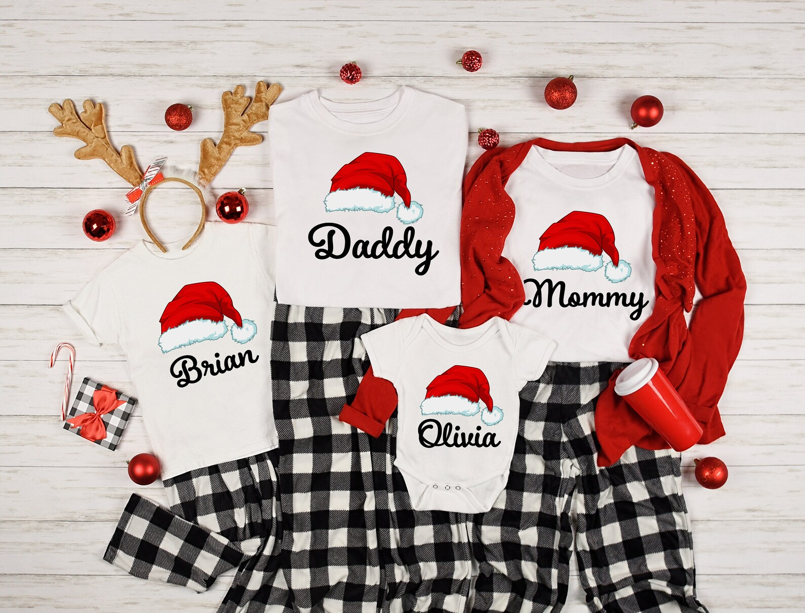 Each shirt is made from premium Gildan 8000 polycotton fabric — soft, breathable, and durable for everyday wear. The cheerful Santa hat design is paired with your chosen names (Mommy, Daddy, Brian, Olivia, or any name you’d like) in a playful script font, making each tee uniquely yours.