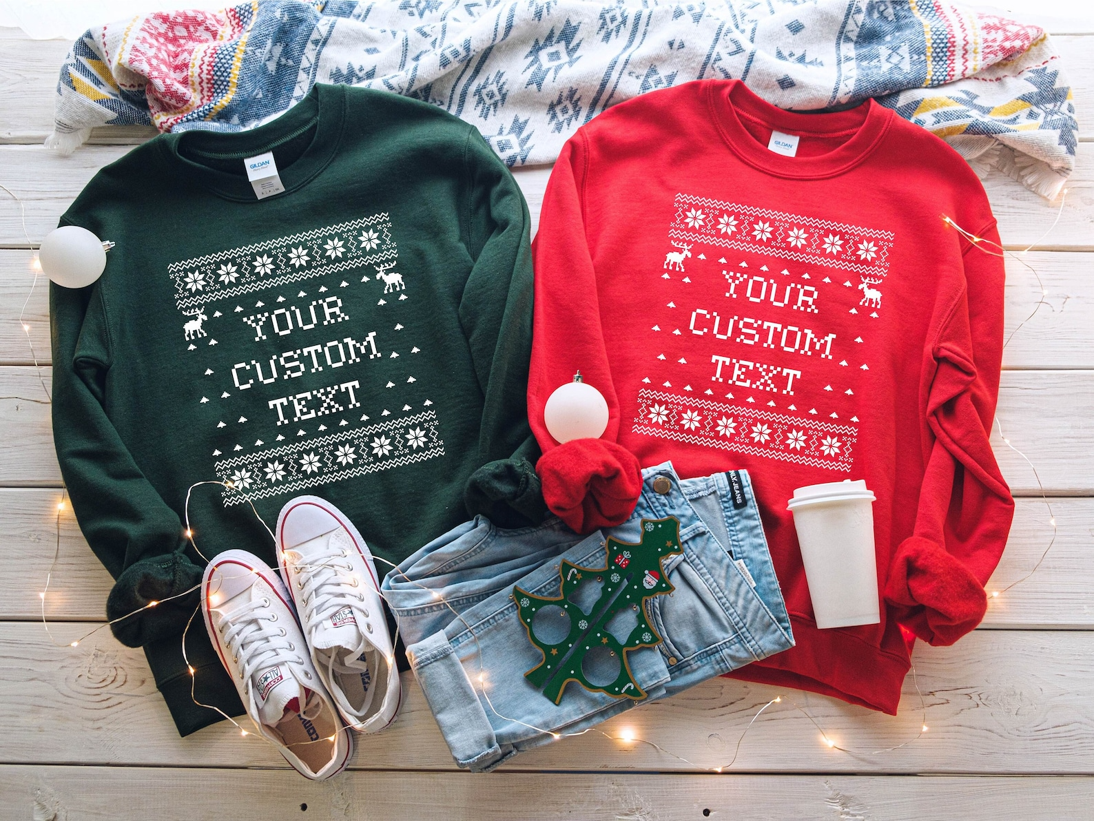 Celebrate the holidays your way with this custom Christmas sweatshirt! Designed in a classic ugly sweater style with festive snowflakes, reindeer, and winter patterns, this cozy crewneck lets you add your own text — whether it’s your name, a funny quote, or a special holiday message.